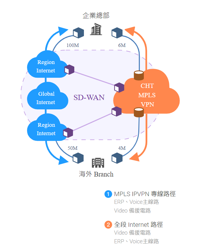Chunghwa Telecom SD-WAN service platform is built on 60 nodes and 8 foreign IDCs, seamlessly connecting MPLS IPVPN networks, TWGate Managed Internet services, Chunghwa Telecom satellite services, stable regional partners, and mobile networks. With 9 global SD-WAN PoPs interconnected through Chunghwa Telecom's MPLS network, the platform ensures high-quality global coverage and connectivity. Additionally, it offers flexible, scalable bandwidth and high transmission quality powered by SLA-driven technology, breaking traditional barriers to deliver seamless and reliable business performance. This comprehensive setup enables Chunghwa Telecom to provide customers with local, one-stop service platforms across China, Asia, Southeast Asia, Europe, and the Americas.Feature